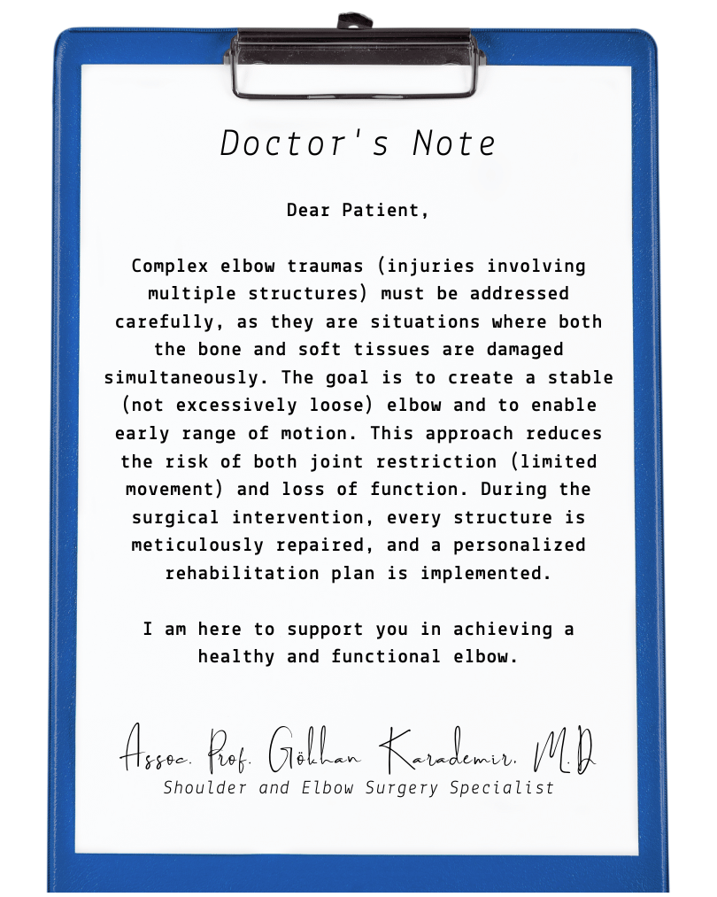 Complex trauma often includes a radial head fracture, a coronoid process fracture, an olecranon fracture, or ligament injuries (damage to the tough bands that connect bones) along with these structures. Such combinations are also referred to by names like the “terrible triad.” If these conditions are not treated correctly, they can lead to permanent joint instability (excessive looseness), limited range of motion, and pain.
