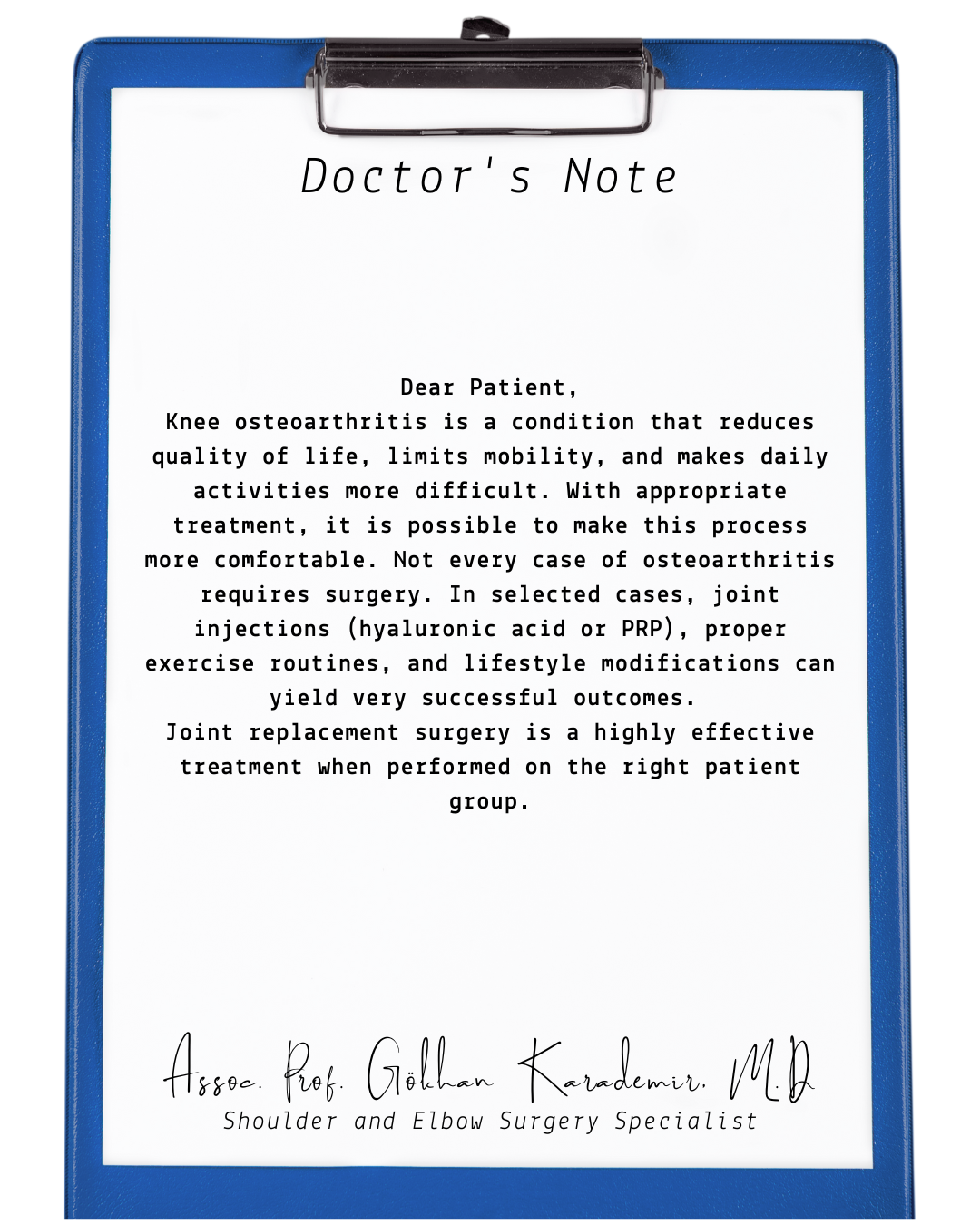 In the early stages of knee osteoarthritis, symptoms can often be managed with conservative treatments such as medication, exercise, weight control, physical therapy, and intra-articular injections (e.g., hyaluronic acid, PRP). However, in more advanced cases, these methods may become insufficient, and surgical intervention may be necessary.