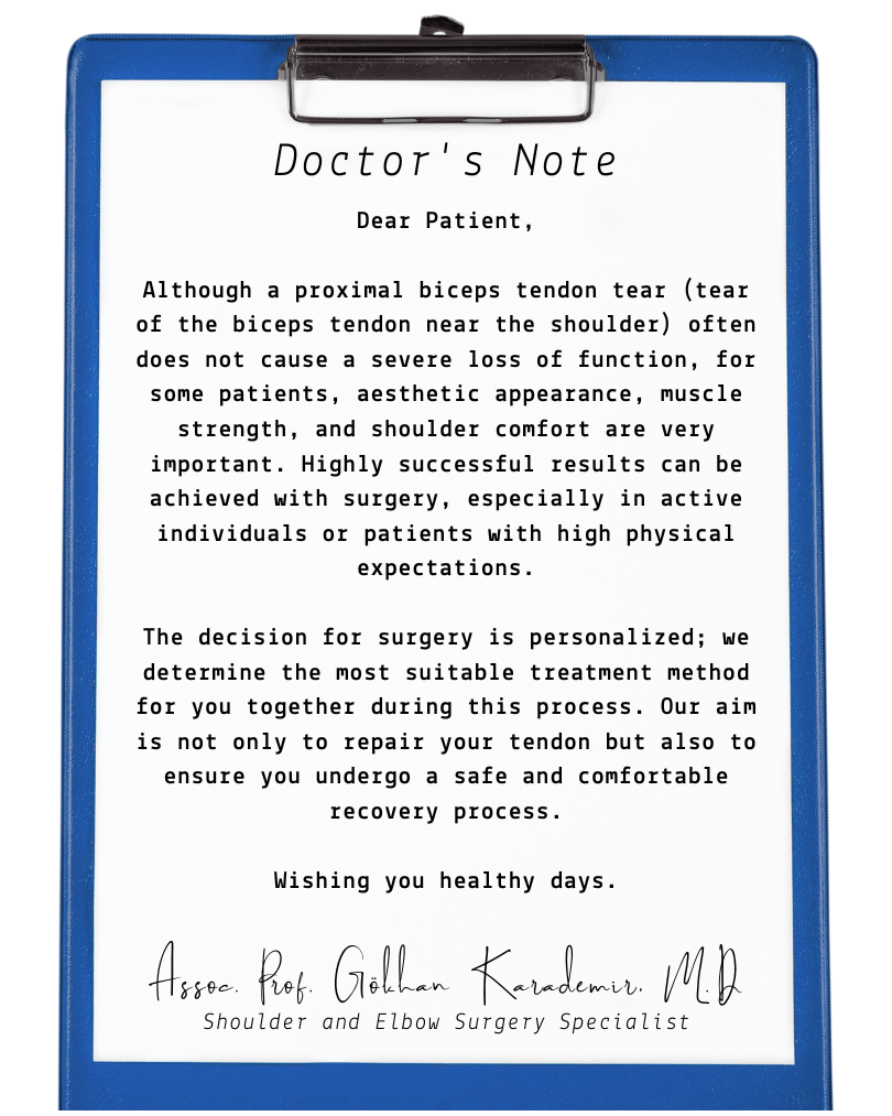 These types of ruptures are most common in older individuals who have degenerative changes (age-related wear and tear) or chronic damage in their shoulder. At the time of the rupture, there may be a sudden “popping” sensation and pain in the shoulder. Subsequently, bruising may appear on the forearm, and the upward displacement of the muscle can create a characteristic “Popeye deformity” (a visible bulge in the upper arm). The loss of strength is generally mild; however, the aesthetic deformity and the potential for long-term pain can be bothersome to patients.