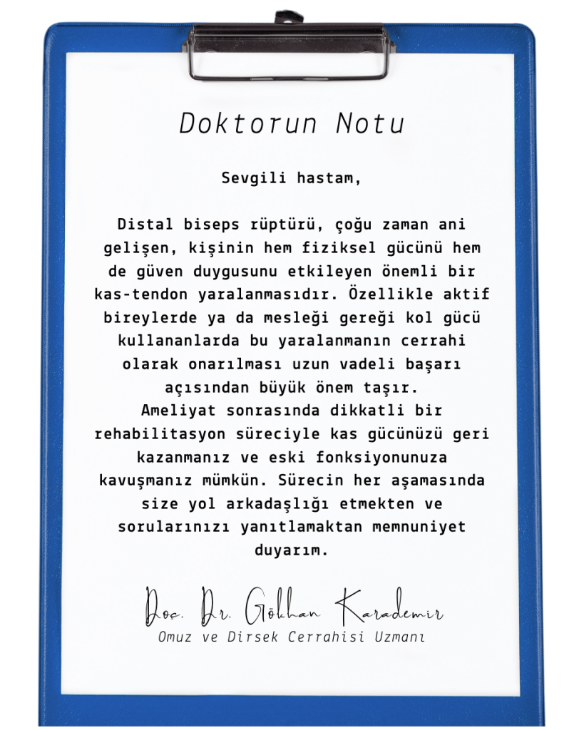 Biseps kası, omuzdan dirseğe uzanan ve kolun hem bükülmesini (fleksiyon) hem de dışa döndürülmesini (supinasyon) sağlayan önemli bir kastır. Bu kasın dirsek hizasında yer alan alt (distal) tendonunun kopması, genellikle aniden ortaya çıkan bir travma sonucu oluşur. Bu duruma “distal biseps rüptürü” adı verilir ve özellikle ağırlık kaldırma, ani yüklenme ya da ani çekme hareketleri sırasında meydana gelir.