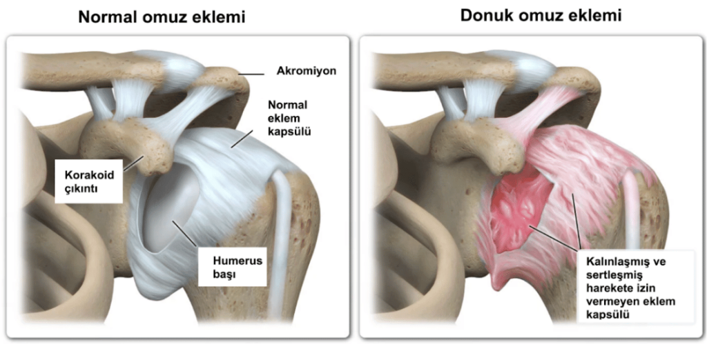 Donuk omuzun nedeni her zaman net olmamakla birlikte, diyabet hastalarında, tiroit hastalıklarında, uzun süre omzunu kullanamayan kişilerde veya geçirilmiş travma/cerrahi sonrası daha sık görülür. Hastalık genellikle 40–60 yaş arası bireylerde ortaya çıkar ve kadınlarda biraz daha yaygındır.Hastalık süreci genellikle 3 evrede seyreder: