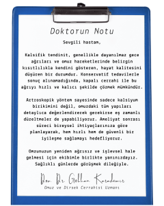 Kalsifik tendinit, omuzdaki kas-tendon yapılarında (özellikle supraspinatus tendonunda) kalsiyum birikimi sonucu oluşan oldukça ağrılı bir durumdur. Bu kireç birikintileri zamanla tendonun içinde veya çevresinde baskı oluşturarak, hareket kısıtlılığına ve gece ağrılarına yol açar. Özellikle 30–60 yaş arası aktif bireylerde ve kadınlarda daha sık görülür.