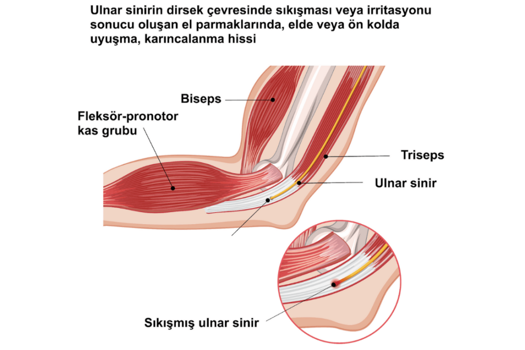 Hastalar genellikle el uyuşması, parmaklarda karıncalanma (özellikle yüzük ve serçe parmak), dirsekte ağrı, el kaslarında zayıflama ve güç kaybı gibi şikayetlerle başvururlar. Özellikle uzun süre dirseğin bükülü pozisyonda kalması (örneğin uyurken, masa başında çalışma) semptomları artırabilir.