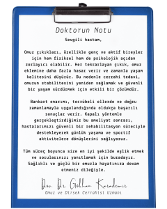 İlk 3–4 hafta boyunca kol askısı kullanımı önerilir. Bu süre boyunca omuzun korunması çok önemlidir.